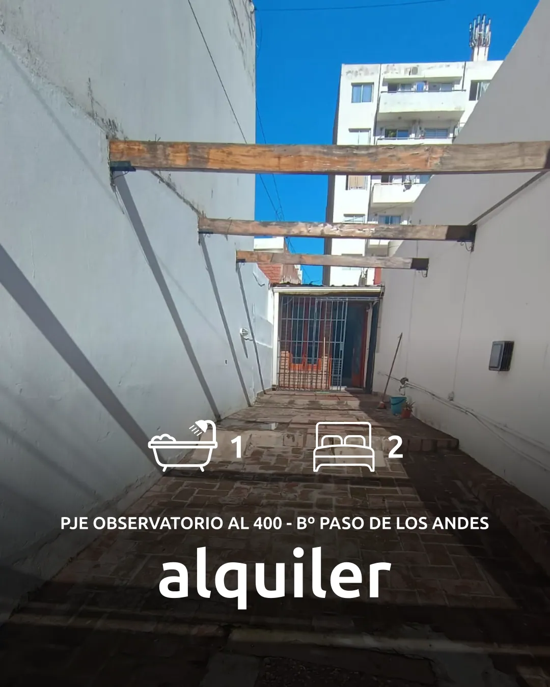 Casa | En Alquiler Alquilada 2 dor.zona : Centro | barrio : Paso de los Andes Dir: Pasaje Observatorio 425 Cod. propiedad: 04291 $ 750.000Casa enalquiler y ventaUbicada sobre pasaje observatorio 425. Esquina bv San Juan.2 dormitorios con placarescocina separadaliving comedorcomedorbañocochera para dos autosPatio internoterraza. Preg. por Whatsapp